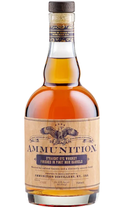 Discover Ammunition Whiskey Rye Straight Finish in Pinot Noir Barrels 750ml. Aged in California wine barrels for a bold, smooth taste with hints of red fruit.
