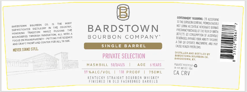 Experience the innovation and tradition of Bardstown Bourbon Company with their Single Barrel Private Selection. Aged for 6 years and crafted with a unique mash bill of 50% corn, 45% wheat, and 5% malted barley, this Kentucky Straight Bourbon Whiskey delivers a refined and complex flavor profile. Bottled at cask strength with 59% ABV (118 proof), it is finished in specially curated old-fashioned barrels, enhancing its rich, full-bodied character. Bardstown Bourbon Company is celebrated for its dedication to transparency and pushing the boundaries of bourbon craftsmanship, creating a premium experience for enthusiasts and collectors alike. Key Features Type: Kentucky Straight Bourbon Whiskey Mash Bill: 50% corn, 45% wheat, 5% malted barley Age: 6 years Finish: Old-Fashioned Barrel Finish ABV: 59% Proof: 118 Volume: 750ml Origin: Bardstown, Kentucky Tasting Notes Nose: Subtle hints of caramel, vanilla, and citrus zest. Palate: Smooth