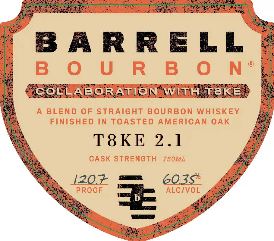 Experience the next evolution of craftsmanship with Barrell Bourbon T8KE 2.1, an exceptional cask strength straight bourbon whiskey finished in Toasted American Oak. Created in collaboration with acclaimed whiskey reviewer T8KE, this limited release takes the 2023 Private Release to bold new heights through extended aging and expert barrel selection. Distilled in Kentucky, Indiana, and Tennessee, this bourbon undergoes an additional 16 months of secondary maturation in heavily toasted barrels. The result is a dramatically enriched and matured flavor profile that brings out the heart of Barrell Craft Spirits”blending expertise. At 120.7 proof (60.35% ABV), this uncut and unfiltered expression reveals intense layers of baking spice, vanilla bean, crème brûlée, and caramelized brown sugar, followed by bold accents of barrel char, dark tobacco, and a subtle black pepper kick. Every sip delivers texture, warmth, and complexity — making it