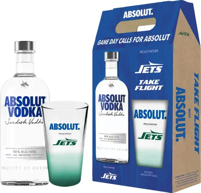 “Made from Swedish water and winter wheat . The mouthfeel is exceptionally smooth. Settling very peacefully it slowly descends in a harmonized way. The taste has slight hints of caramel and vanilla and the finish is fresh and fruity. It is the true definition of balance and harmony.” Tasting Notes Gift set includes one 750ml bottle of Absolut Vodka and a commemorative Jets Pint Glass