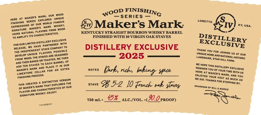 A special release from the Maker’s Mark Wood Finishing Series, this 2025 Distillery Exclusive celebrates the art of stave finishing with a bold and complex take on their classic wheated bourbon. Developed in partnership with the Independent Stave Company, this limited-edition expression is finished with 10 seasoned and toasted French oak staves (Stave profile: SB 5-2) and matured in Maker’s signature limestone cellar. Bottled at 45% ABV (90 proof), this bourbon amplifies the signature richness of Maker’s Mark with added depth from the toasted oak. Expect a darker, more spiced profile with notes of baking spice, chocolate, and warm vanilla. Non-chill filtered for maximum flavor integrity. Tasting Notes: Nose: Toasted oak, vanilla, and brown sugar Palate: Dark chocolate, cinnamon, nutmeg, and subtle caramel Finish: Long and warming with layered baking spice and charred oak How to Enjoy: Neat or with
