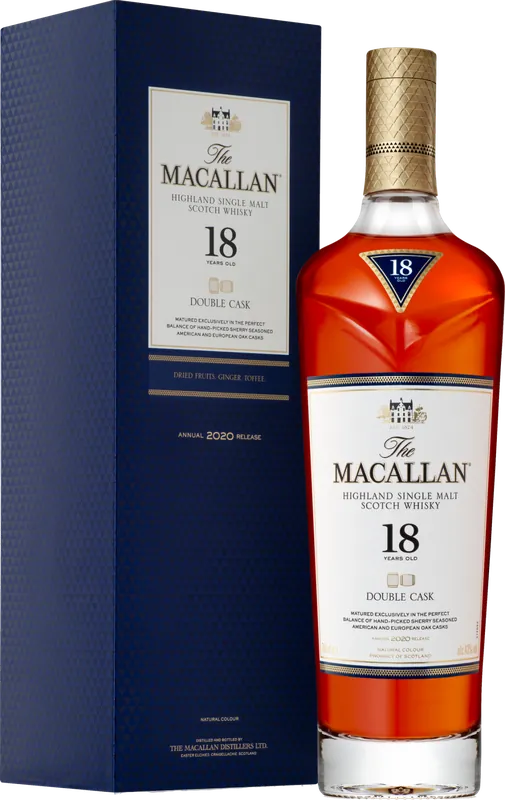 “The Macallan Double Cask 18 Years Old, a perfectly balanced single malt whisky matured for 18 years in both American and European sherry seasoned oak casks. Sherry seasoned American oak adds delicate vanilla to the subtle spice of European oak, delivering a whisky with a sweeter, warmer taste and character.” Tasting Notes
