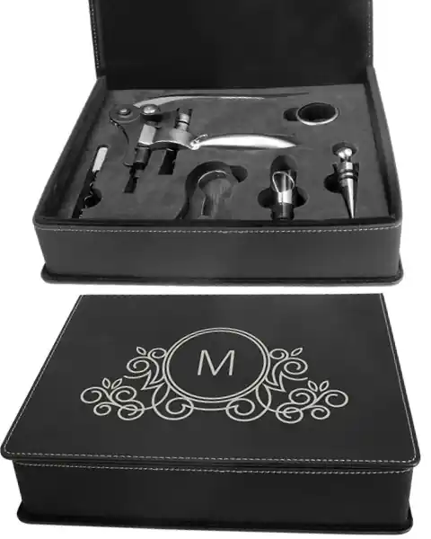 Includes “rabbit style” corkscrew, replacement screw, drip collar, decanting pourer, stopper and a plastic foil cutter, in an engravable leatherette gift box. Leatherette offers the look and feel of genuine leather at a fraction of the price. The richly textured, high quality workmanship of each leatherette piece is sure to impress and includes a magnetic closure. We can engrave any message, logo or design in silver.